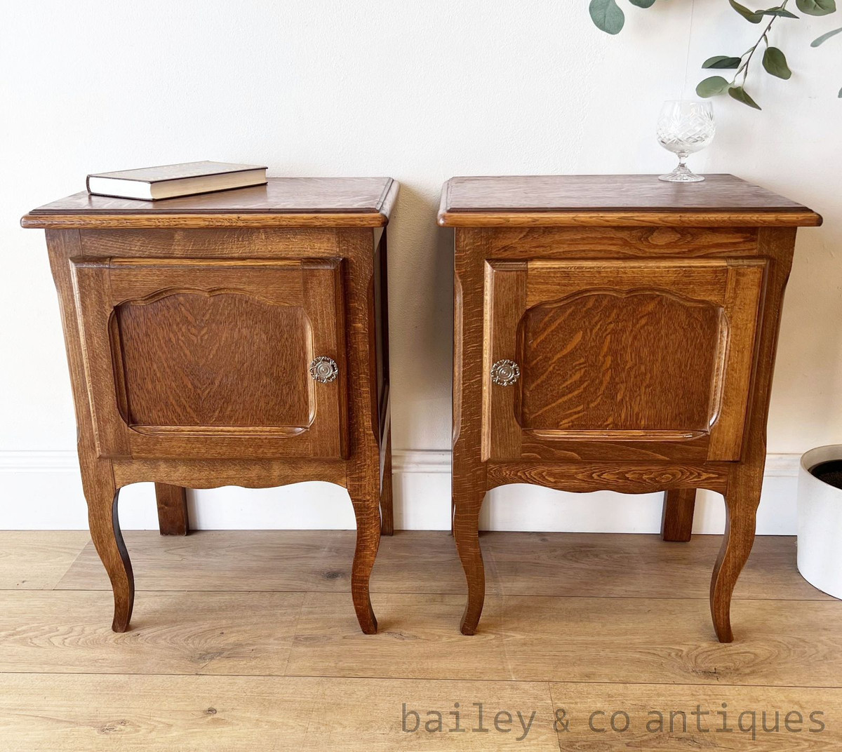 These elegant cabinets are made from solid oak, featuring gently shaped tops, carved skirts, and classic Louis legs. Each cabinet has a single panelled door with recessed moulding, enhanced by original turned metal handles with floral rosettes.