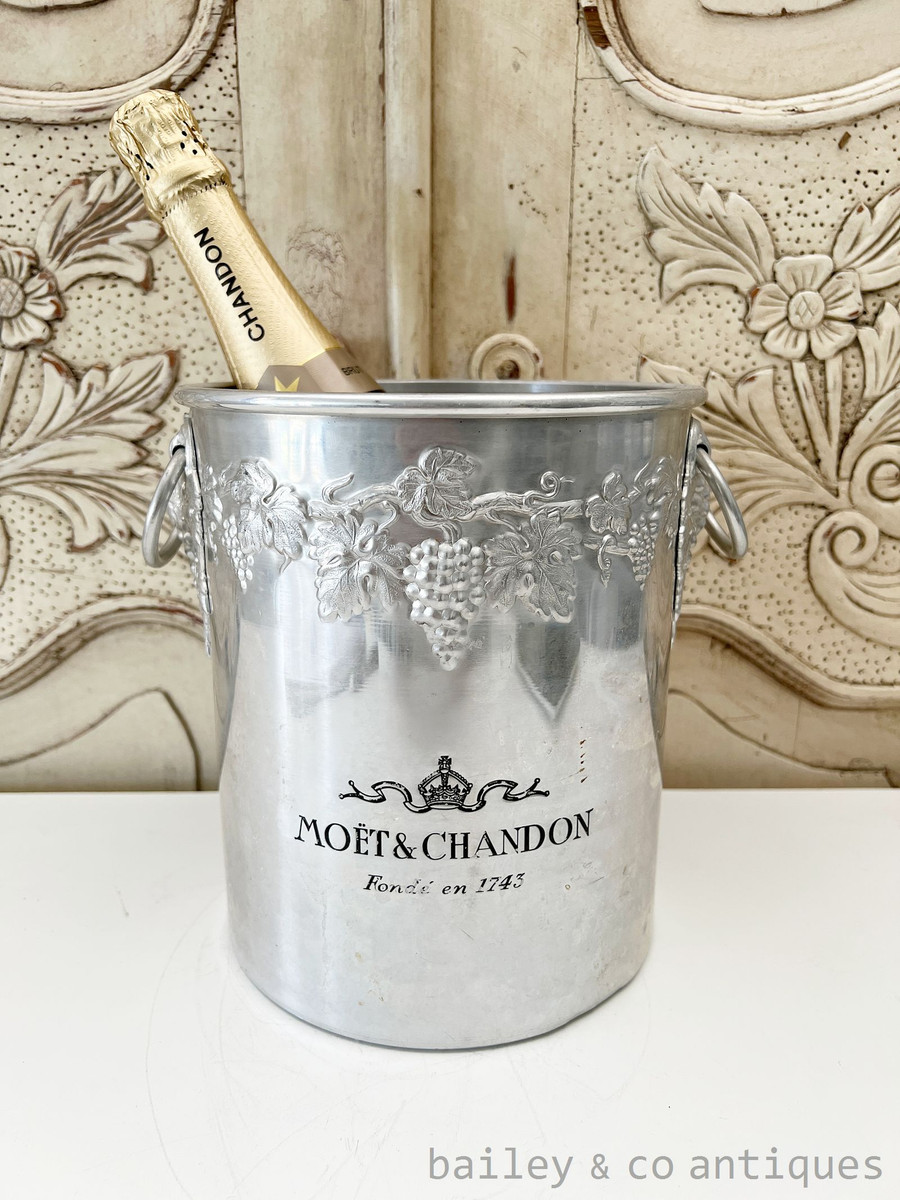 A vintage French Moet & Chandon champagne bucket with grapes design. Please use the photos as a description. This is a heavier bistro model - There are usage marks and a dent as shown on the bottom edge which is not overly noticeable and which would be expected but that is part of its vintage French bistro charm.