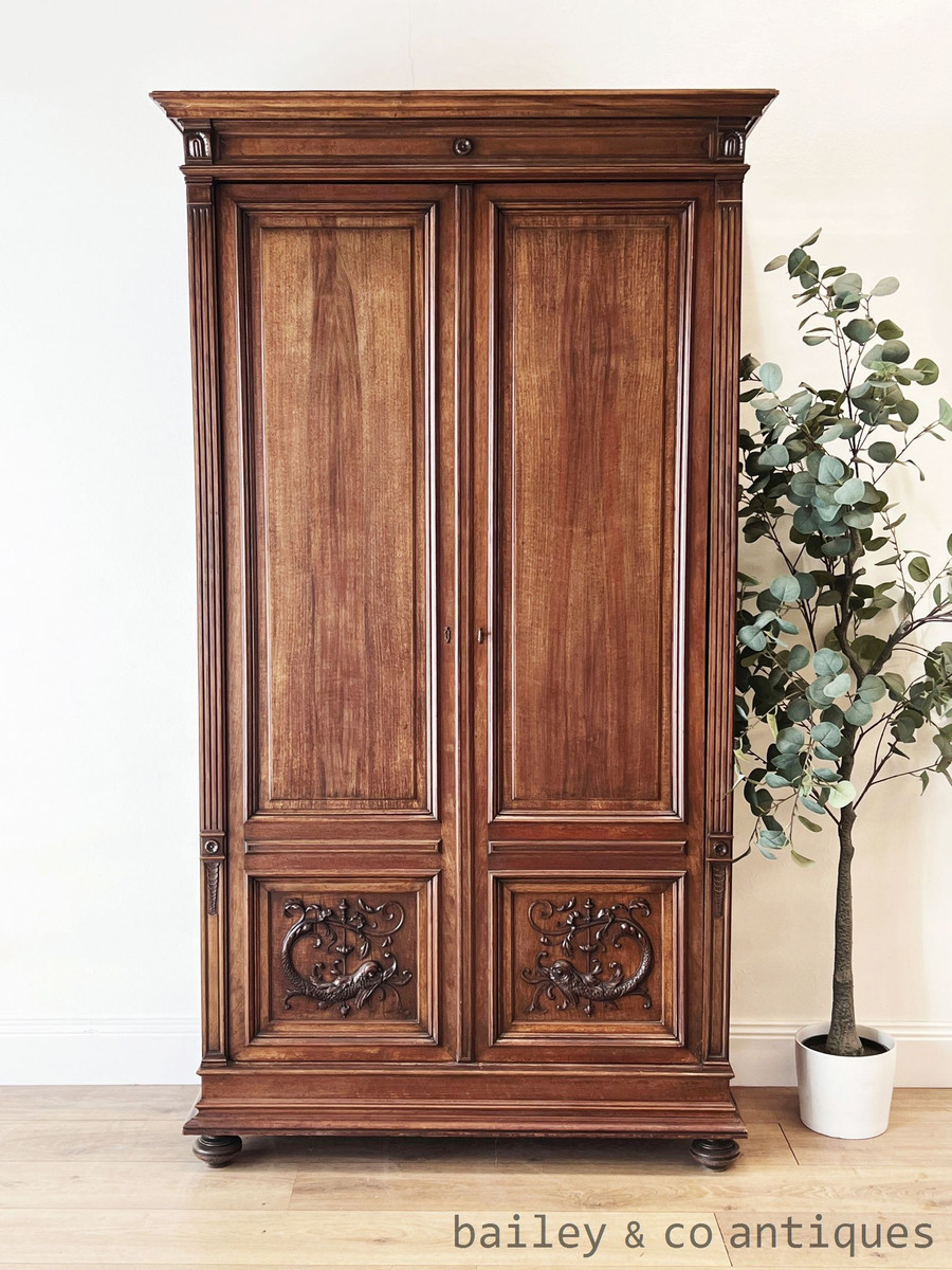 The double doors feature recessed panels and lower sections adorned with stylised dragons or sea creatures, framed by acanthus foliage in full relief. Carved rosettes and fluted pilasters add structure and rhythm to the front, while a strong cornice top crowns the piece. Internally, the armoire offers spacious storage with removable shelving or add a hanging rail if desired.