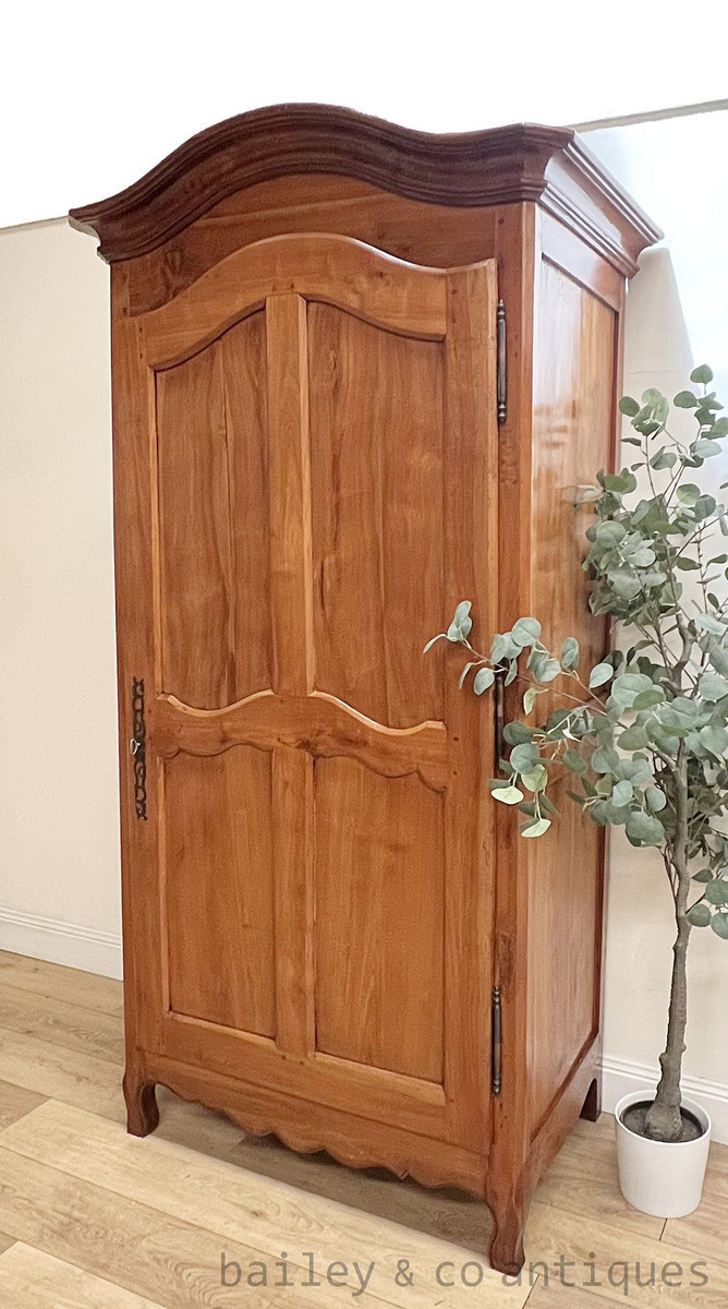 An antique French Louis XV style single door armoire with a domed top which is deep enough for hanging clothes. (Shelving could be added if preferred). It features wonderful old dowel construction and the interior and back was constructed from rough hewn planks. There are long gone and old borer holes, (genuine antique French furniture very often has old borer holes - this is of no concern as all our pieces are treated by government regulation upon arrival from France) and a few separations in timber joints which does not affect this is any way. This is a spectacular looking piece and is quite solid. There was a newer lock and catch replacement fitted at some stage and it has a working key.
